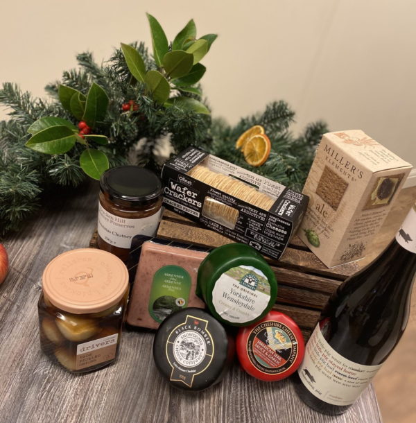 3 x 200g cheese truckles, 125g pate, 2 x packs savoury biscuits, xmas chutney, pickled onions, squealing pig malbec (Contains fresh produce, Product types may change due to availability)
