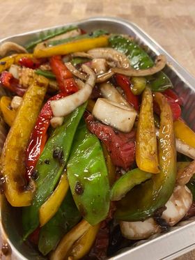 Tender steak strips with baby corn. mange tout & sliced peppers in a black bean sauce.
