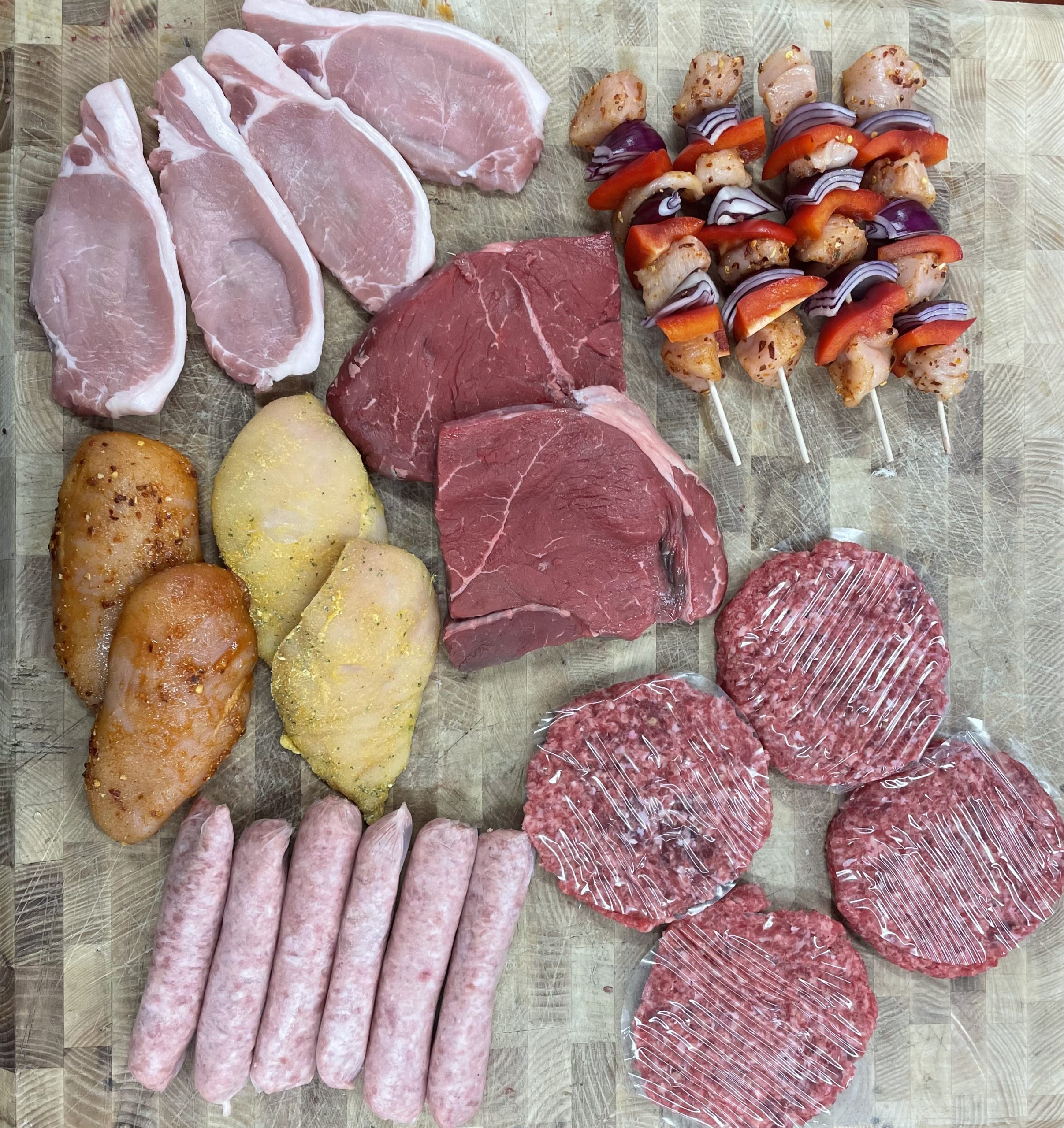 4x Beef Burgers, 6 Classic Pork Sausage, 4 Pork Loin Steaks, 2x Garlic Glazed Chicken Fillets, 2x Sweet Chilli Glazed Chicken Fillets, 4 Chicken Kebabs, 2x 6oz Rump Steaks