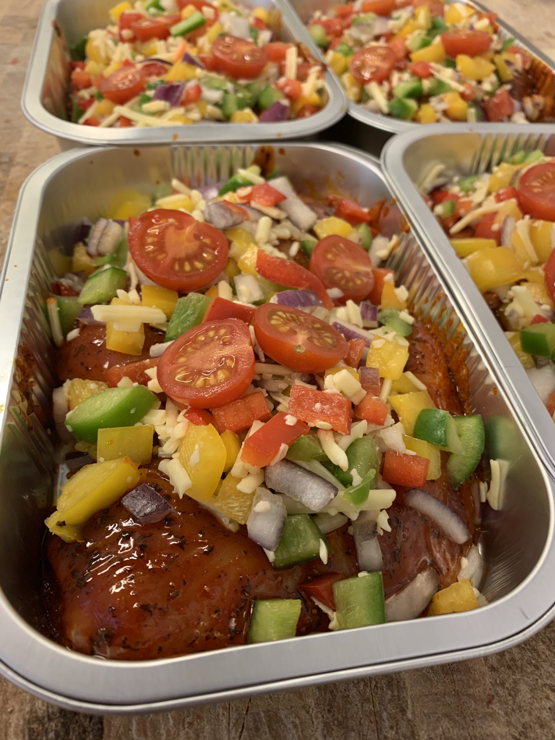 2x Yorkshire reared chicken fillets in a tomato & herb marinade topped with cheese, tomato, peppers and onion.  Bake in the oven for 25-30 mins at 160°C.