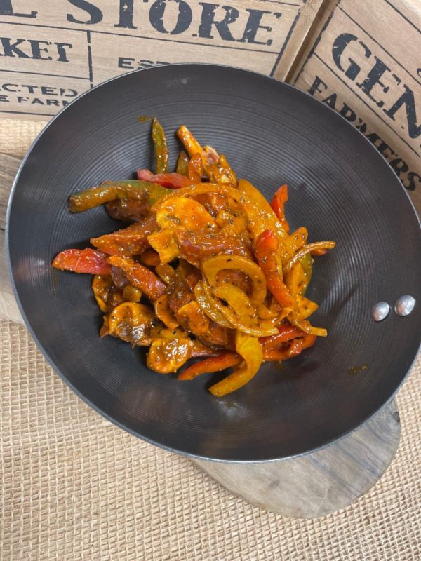 Tender steak strips with sliced onion, peppers & mushroom in a chilli beef sauce.