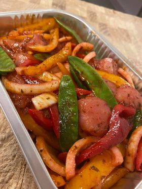 Diced chicken with sliced peppers, onions & mange tout in a Chinese sauce.