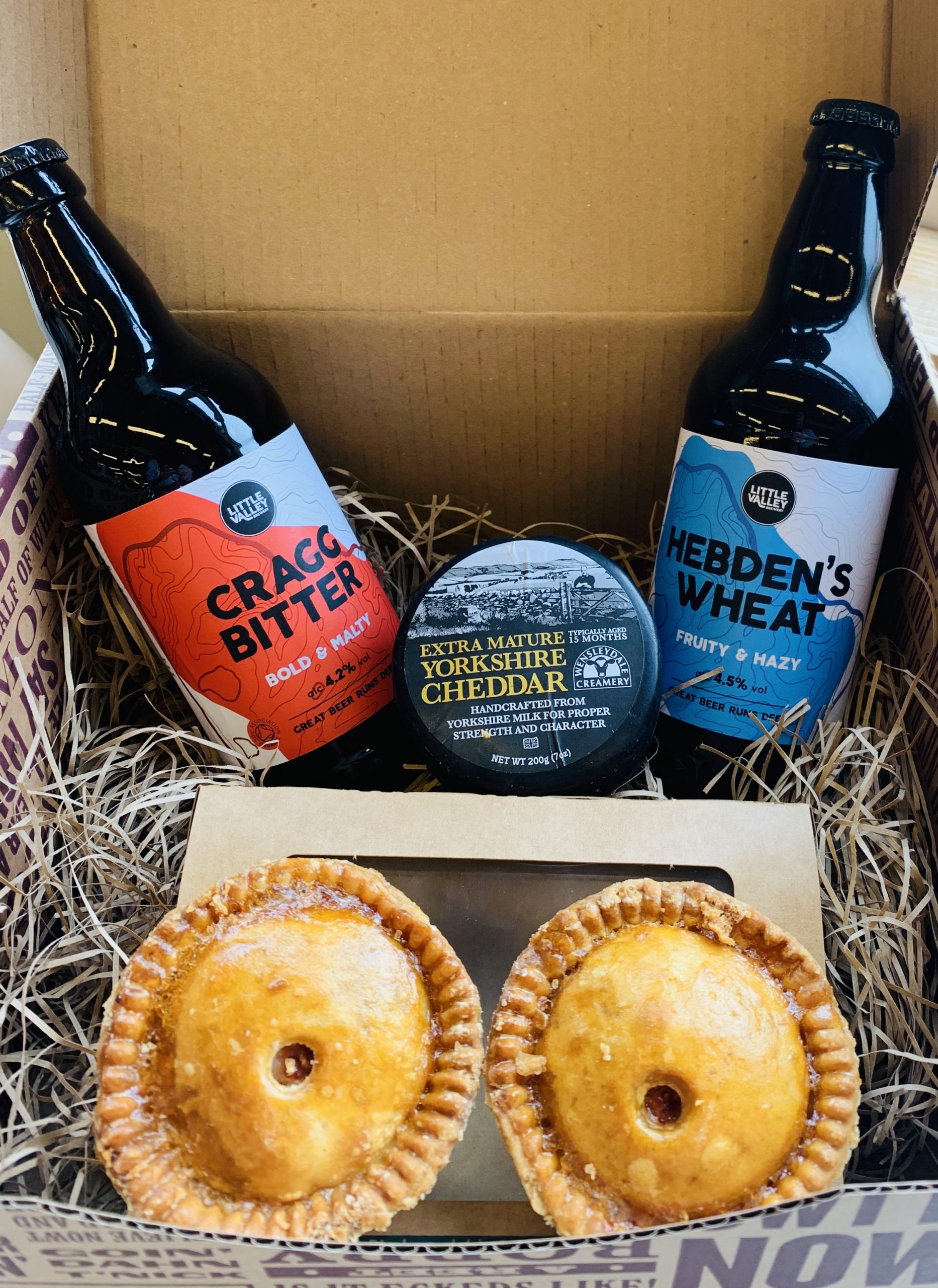 2 x Little Valley beers, 2 x Craggies pork pies, 1 x Yorkshire extra mature cheddar truckle (200g) presented in a gift box (contains fresh produce)