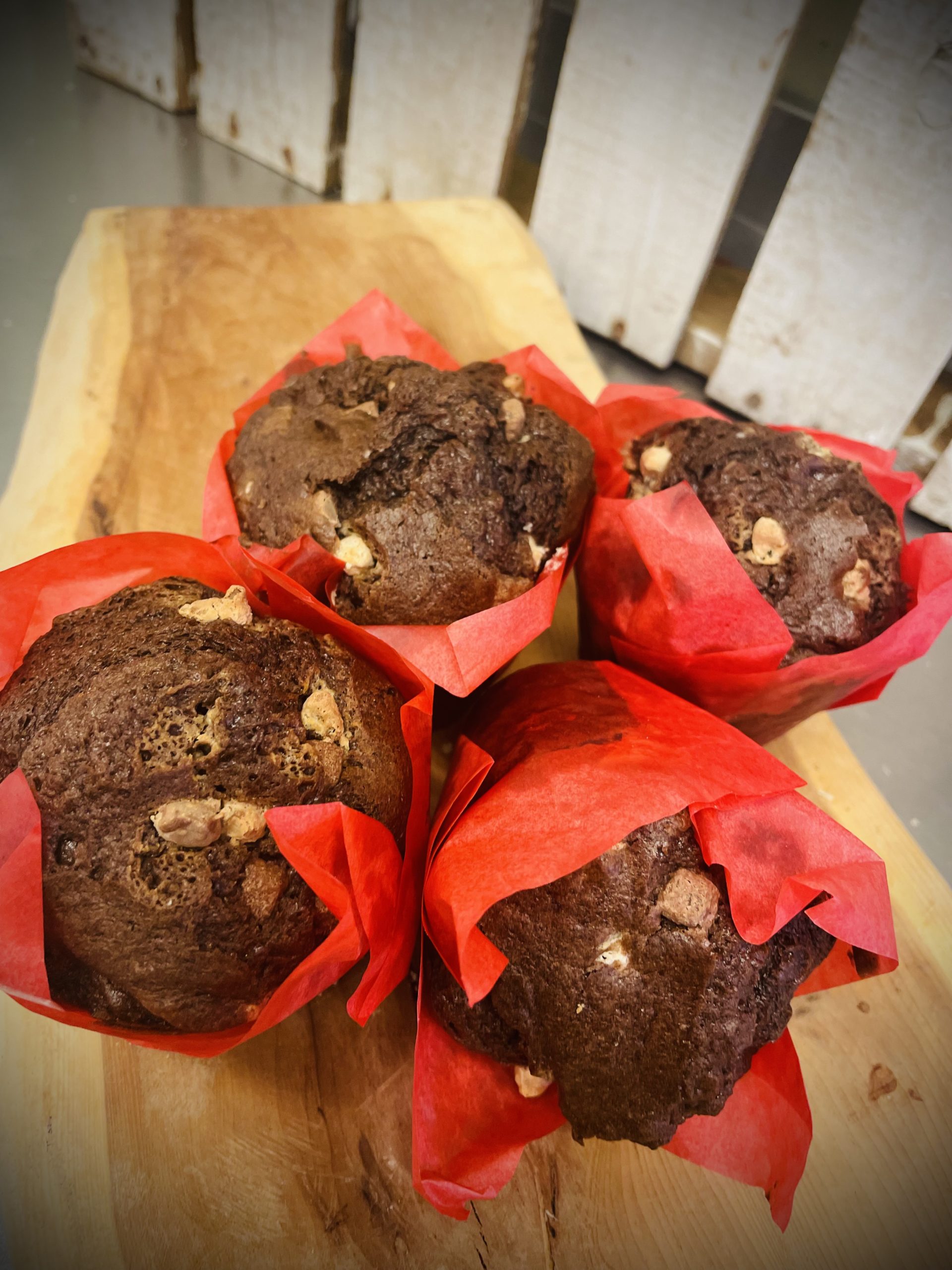 2x Freshly baked chocolate muffins, lovingly made by Craggies.