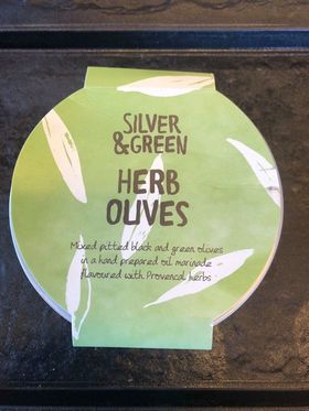 Silver & Green Herb Olives. Mixed pitted black & green olives in a hand prepared oil marinade flavoured with Provencal herbs, 185g.