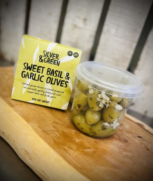 Silver & Green Sweet Basil & Garlic Olives. Pitted green olives in a hand prepared oil marinade gently flavoured with sweet basil & fresh garlic, 185g.