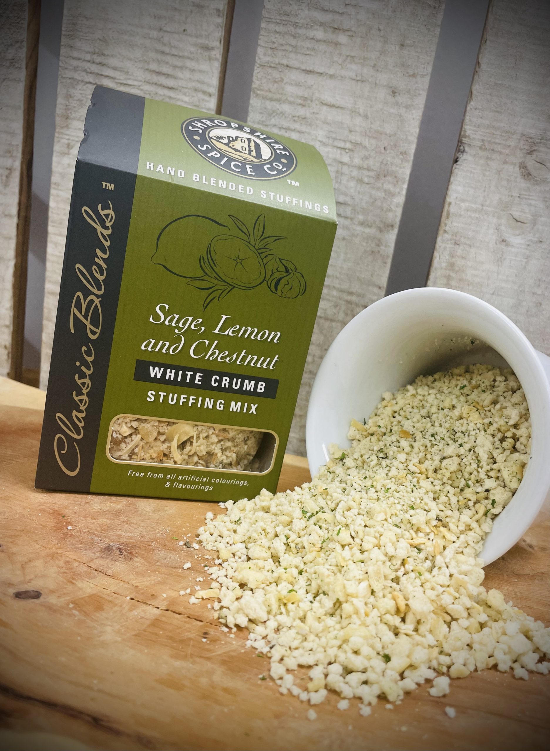 Shropshire Spice Co Hand Blended White Crumb Stuffing Mix with Sage, Lemon and Chestnut.