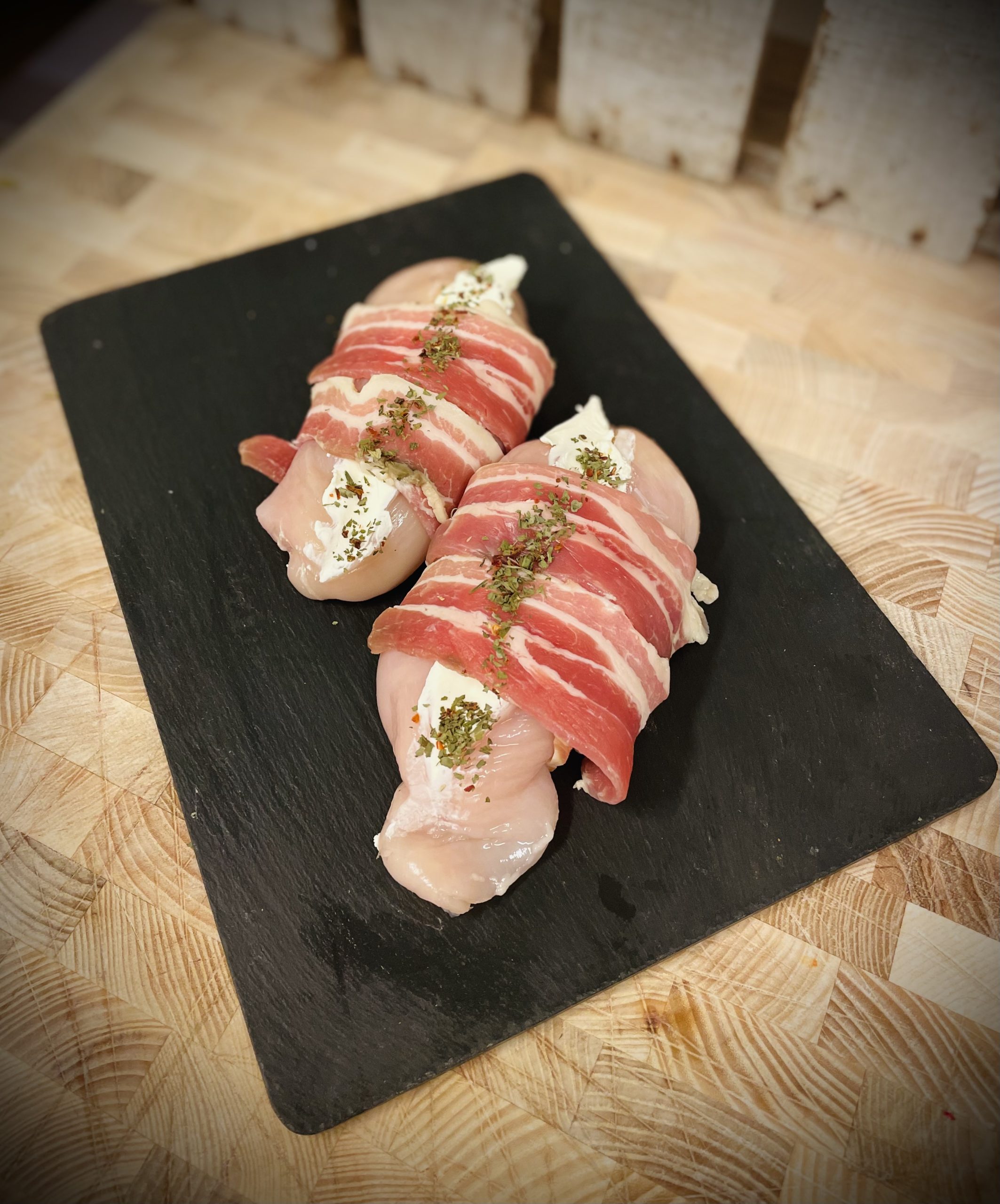 2 x Chicken breast fillets stuffed with longley farm cream cheese, wrapped in dry cured streaky bacon. Cook in the oven for 25-30mins at 180’c. A quick and easy meal idea perfect for any day of the week.